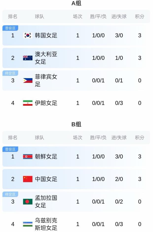 在A组中,东道主澳大利亚1-0小胜菲律宾,韩国3-0完胜伊朗,韩国、澳大利亚同为3分,排名前2位,菲律宾0分第3,伊朗0分垫底。女足亚洲杯共有3个小组(日本、越南、中国台北以及印度在C组),每组4支球队,前2名直接出线,2个成绩最好的小组第3也能进8强。中国队打入淘汰赛很轻松,与朝鲜队的比赛将是小组头名之战。大家说中国女足能击败朝鲜吗?会完成卫冕吗?