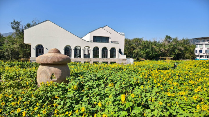 今年的寒冬来得迟。大雪节气前后的向日葵依旧生机盎然:或仰首追日,如稚童踮脚迎接阳光;或垂首敛芒,籽实饱满鼓胀,尽显丰盈而不张扬的生命哲思。葵园外侧,白墙黛瓦的郑培钦艺术工作室静静矗立。工作室黛瓦如墨、白墙似雪,与蓝天、枫杨、金葵相映成景,层次分明又浑然一体。作为专业艺术与乡土文化的交融之地,郑培钦艺术工作室的创建,为这片山水增添了几分清雅文气。