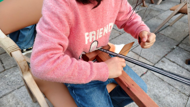 “来看看织带呀?”非遗主理人的温和吆喝,很快招来了一个粉衣女孩。她让女孩坐上椅子,从旁边取来一个带架,把带架一头支在箱子上,另一头置于女孩腹部让其用力顶住。她一边比划,一边讲解,从坐姿手势到挑线理线、穿线压线,不遗巨细,一一示范。女孩神情专注,腰板挺直,一手握住带梭、一手拉紧纱线……粉衣女孩学起织带来可谓有板有眼,一丝不苟。