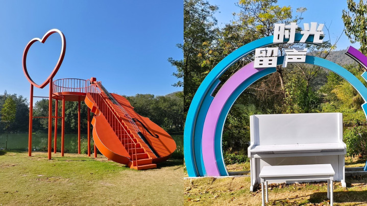 绿道转角处,红色吉他装置现代灵动,“时光留声”唱片下的白色钢琴,琴键轻叩间,流淌着欢笑、乡愁与岁月故事。