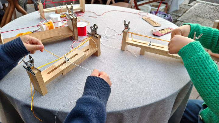 另一边,几个小孩挤在编绳摊位前,学着摊主模样抓起小巧带架,木制架骨在稚嫩掌心微微晃动。他们试着将红、黄、白三色丝线穿过经纬,指尖尚未分清“经”与“纬”,丝线便缠成了小疙瘩,却不肯罢休,皱着眉头慢慢拆解,再重新将线拉得笔直。也有一些孩子凑到竹编艺人身边,捧着细竹丝模仿指尖交错的动作,试图将竹丝弯成篮筐弧度,可竹丝总不听话地弹开,刚编出的雏形歪歪扭扭,却依然得意地举给同伴看。那些歪歪扭扭的彩绳、不成形的小竹篮,虽带着孩童特有的稚嫩,却藏着最纯粹的热爱,成为市集里最动人的传承序曲。