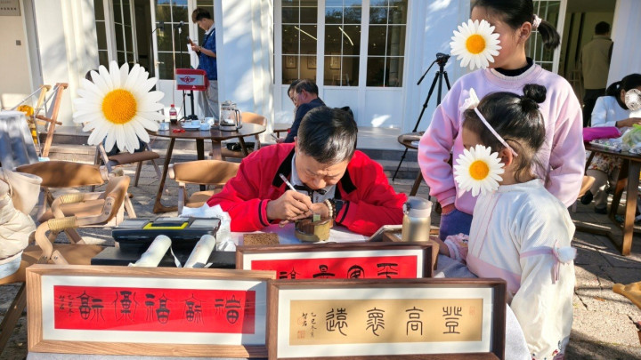 篆刻家胡智君就职于邮政银行,工作之余,痴迷于篆刻艺术,是丽水书法家协会篆刻委员会委员。只见他端坐案前,俯身凑近印石,眉峰微蹙,以刀为笔,以腕运力,切、冲、削、凿,刻刀过处,线条流畅而富有韵律,仿佛是大自然中的山川河流被移植到了方寸之间。摊位上,陈列着他的几幅篆体书法作品——五福、“平安幸福”“登高望远”等,寓意吉祥美好,字形方中寓圆,线条圆劲婉通,尽显典雅雍容之态。一高一矮两个孩子似乎对书法篆刻作品特别感兴趣。她们目不转睛地盯着艺术家爷爷看,看他如何敛息凝神,如何操刀运笔……她们屏住呼吸,默不作声,生怕惊扰了聚精会神创作的爷爷。