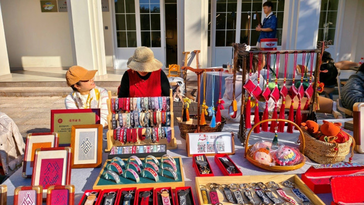 近十点,集市已热闹起来。绿道旁的摊位上,竹编艺人指尖飞舞,细竹丝转瞬化作玲珑篮筐、雅致灯罩;剪纸摊位前,红纸流转间,花鸟人物跃然纸上;书法篆刻作品边,刻刀起落间,篆隶楷行凝于方寸;钩织品摊位上,花卉、动物造型惟妙惟肖,栩栩如生;编绳摊位前,编绳小件小巧别致,色彩斑斓。