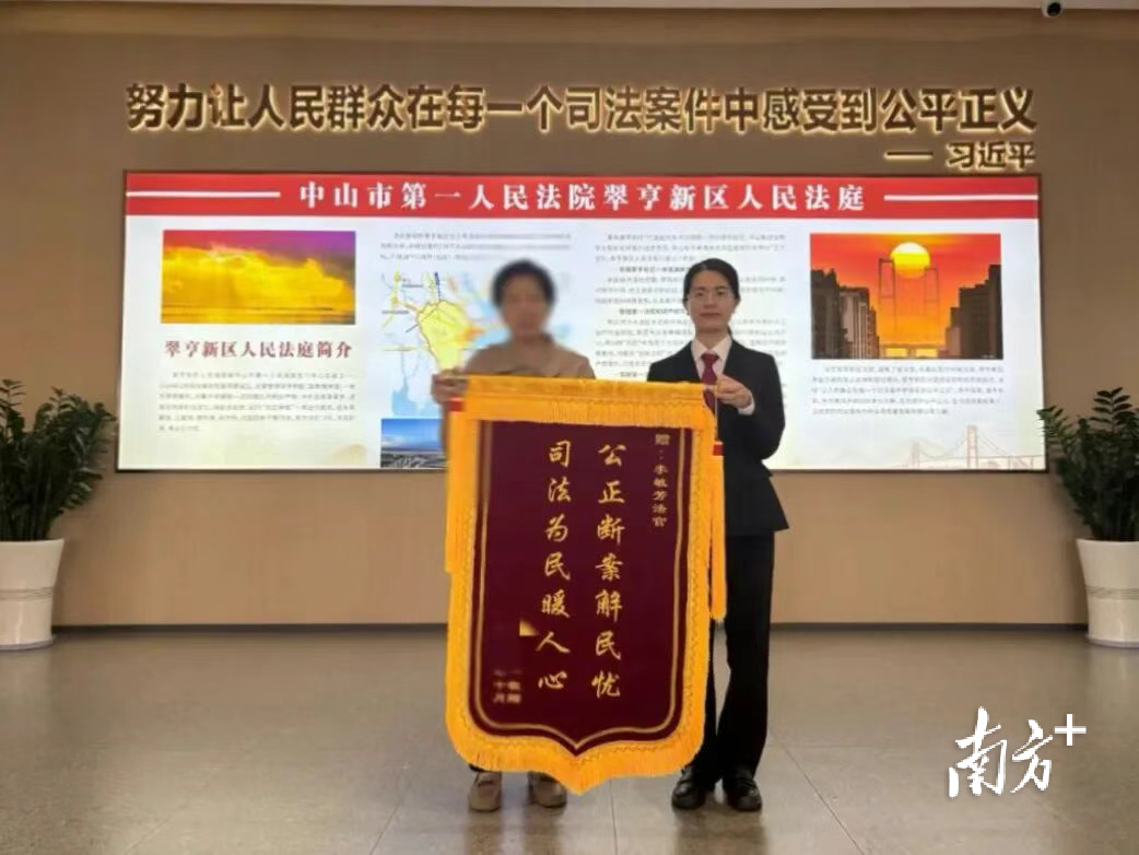 一起数十年的侨房权属纠纷案当事人阮女士向市第一法院翠亨新区法庭李敏芳法官赠送锦旗。 受访者供图