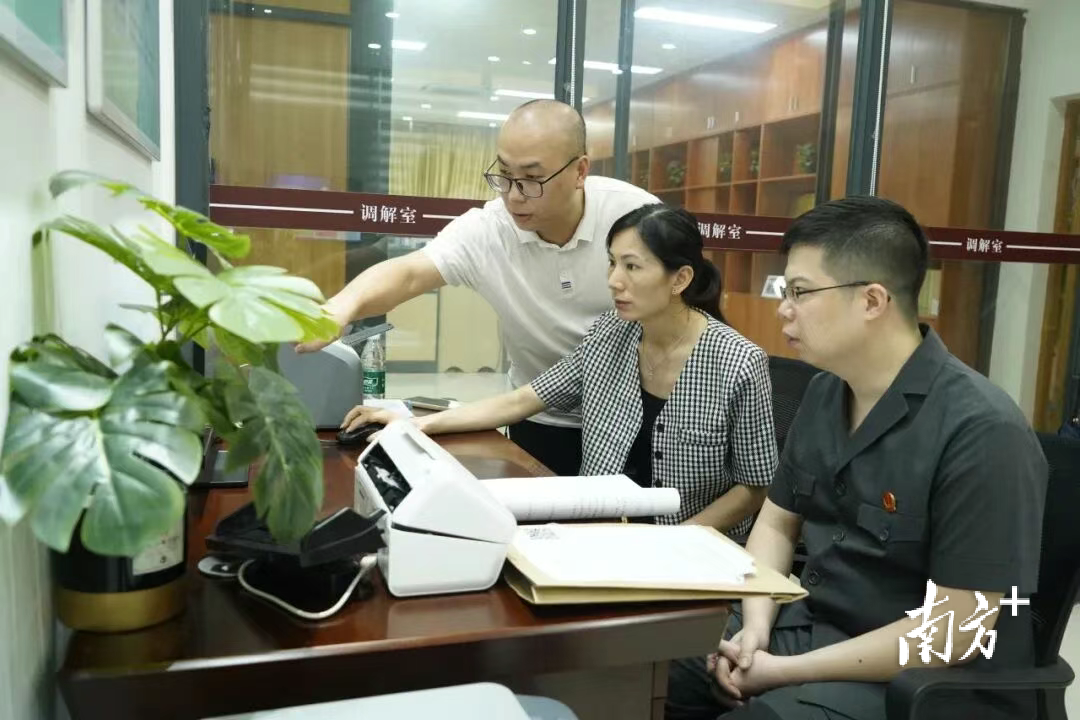 在中山市南头镇商会诉调对接工作站调解室里,法官与商会调解员通过视频调解案件。 受访者供图